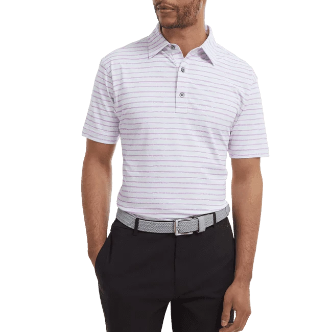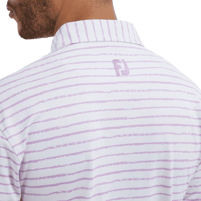 Theย FootJoy Chalk Line Print Pique Golf Shirt employs a classic striped polo design that delivers an authentic tour style to looks great & performs well. SPF 30 UV Protection, moisture wicking and stretch fabric all work together to keep you comfortable so your focus can be on your golf.