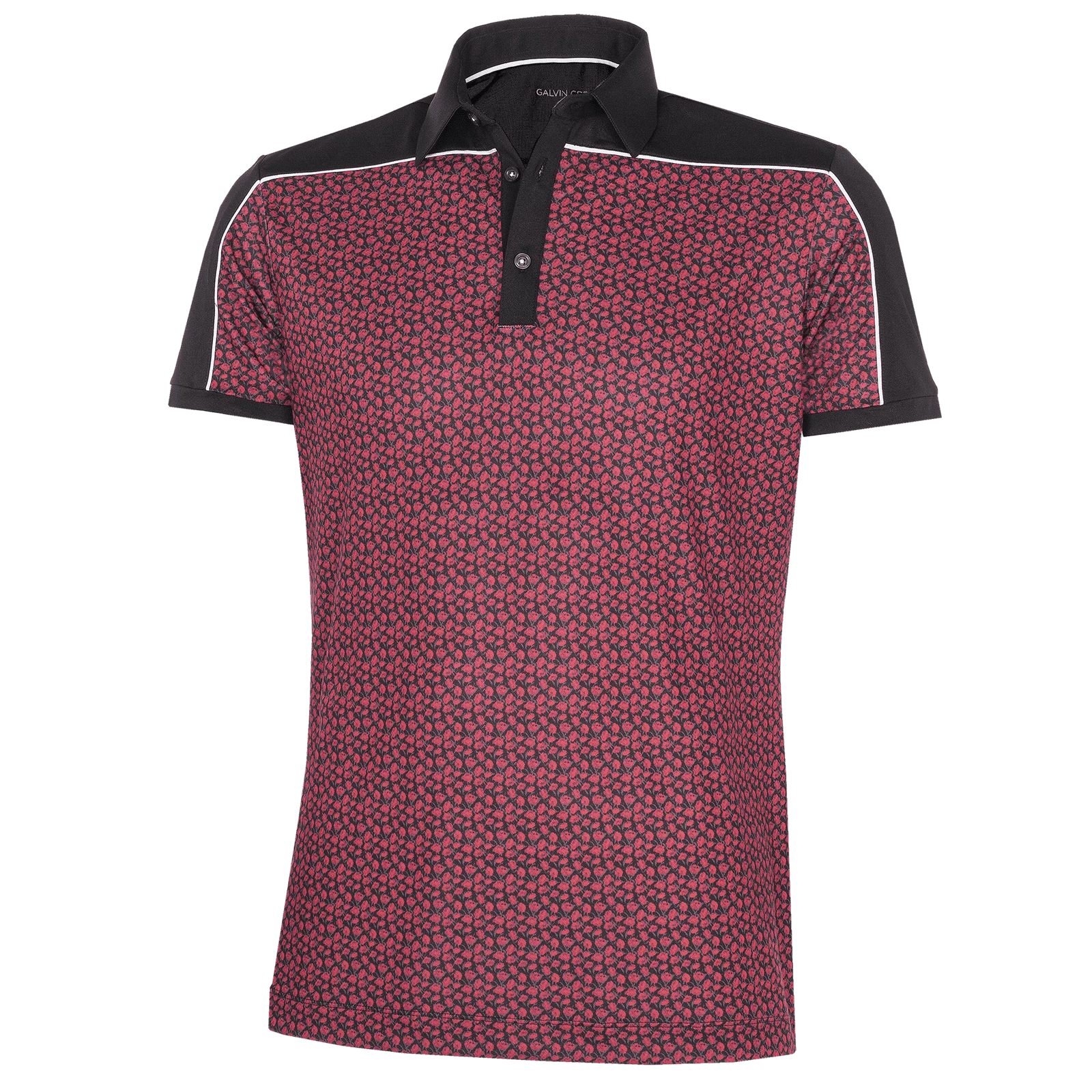 The Galvin Green Millard Golf Polo Shirt is cut and styled with a classic, sporty look. A sewn collar and open sleeve ends bring a breathable stylish shirt to your wardrobe. Breathable, fast-drying materials with moisture wicking properties ensure lasting comfort on the course. The all-over pattern is bold & stylish while the contrasting solid colour collar, shoulders & sleeves help to accentuate the sporty look.