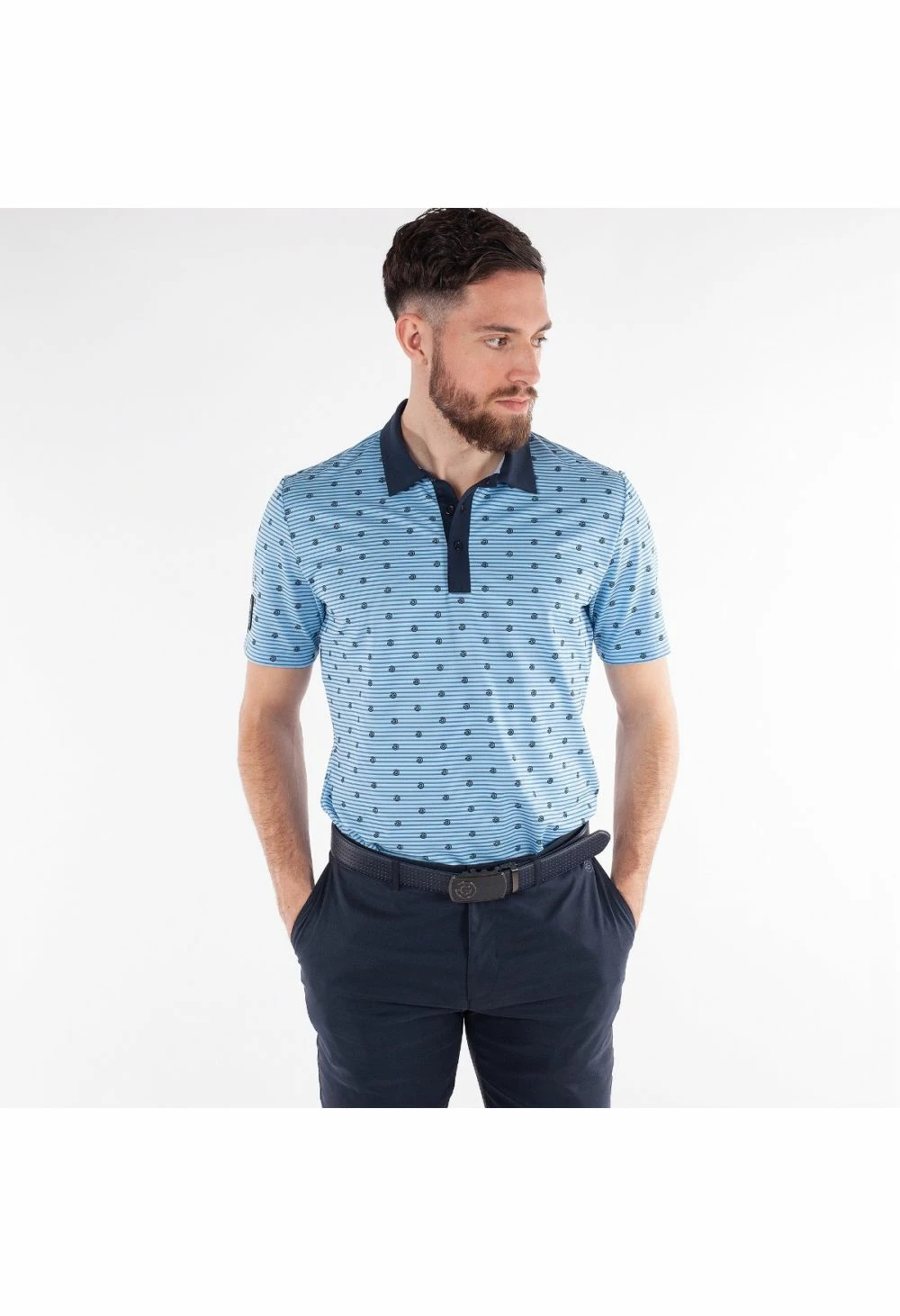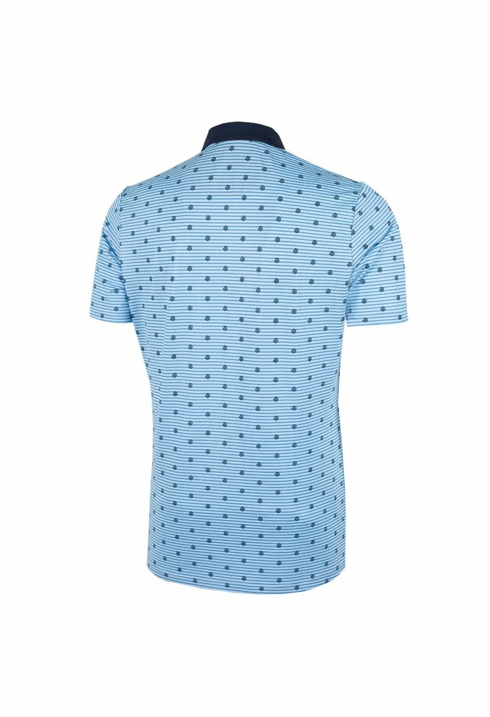 This polo shirt looks as good as it performs. The blue bell print with stripes perfectly contrasts the navy sewn collar and placket. The stylish design is complete with an all-over ‘G’ logo print design and Galvin Green branding on the right sleeve.